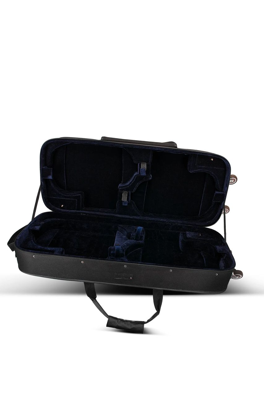 Organiza los instrumentos en dos niveles: dos en la base y dos en la tapa. Así optimiza el espacio sin que los violines se toquen entre sí. Su núcleo de espuma rígida de alta densidad (Polyfoam) mantiene el peso manejable a pesar del gran tamaño. También ofrece aislamiento térmico superior para los cuatro instrumentos.