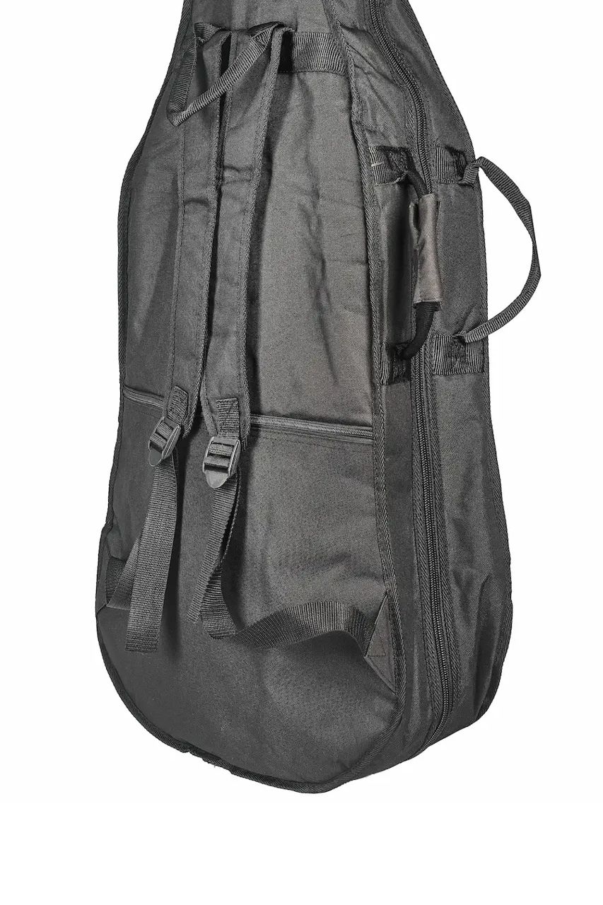 Para facilitar el transporte, posee asas reforzadas laterales y frontales, además de dos correas ajustables tipo mochila, esenciales debido al volumen del contrabajo. Dimensiones de referencia para tamaño 3/4: longitud total aprox. 186-188 cm, ancho inferior 70-74 cm.
