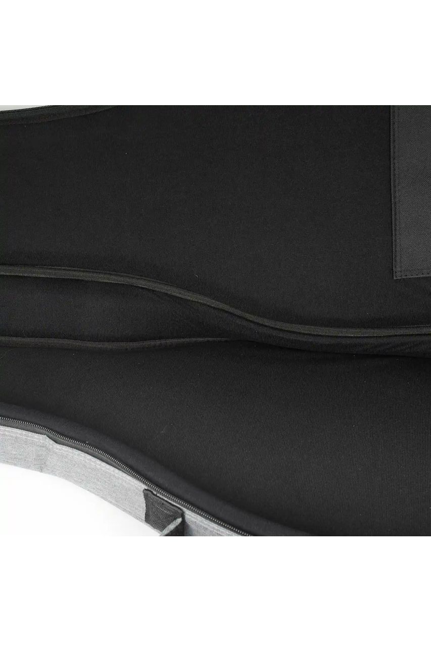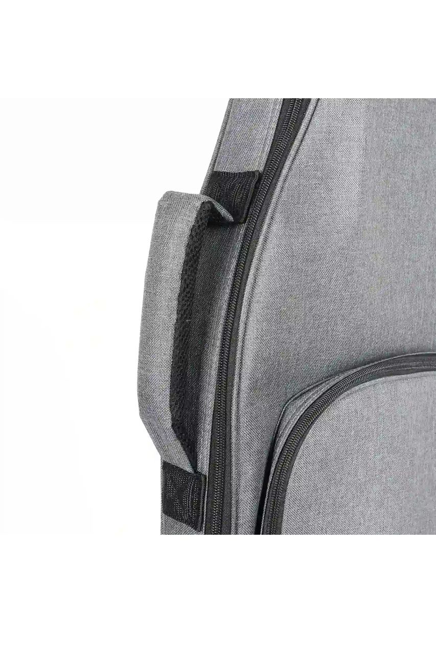Incluye bolsillo frontal grande para partituras A4, cables o tableta, y bolsillo superior pequeño para afinadores, púas o cuerdas. El sistema de transporte incorpora doble correa ajustable y acolchada con material transpirable, además de asa lateral reforzada para carga manual tipo maletín.