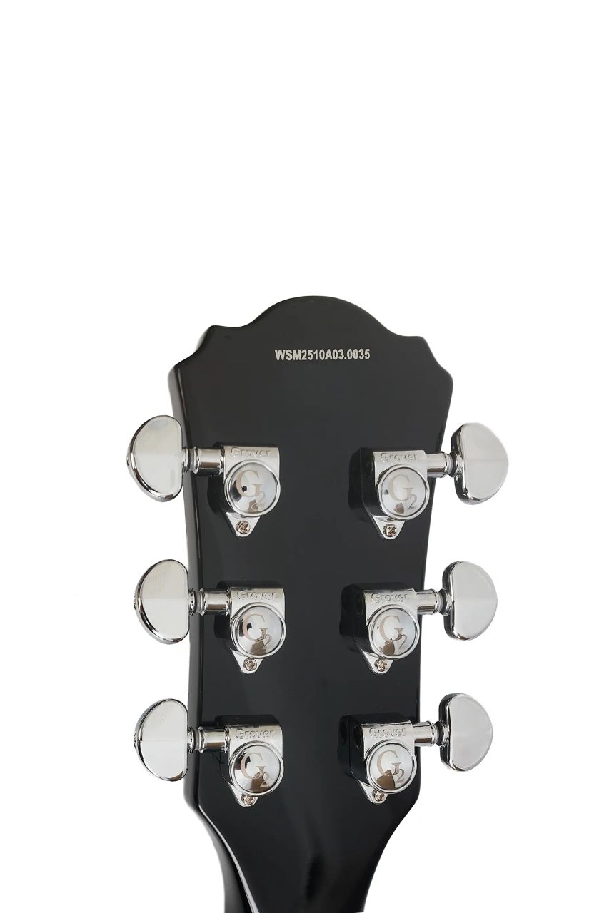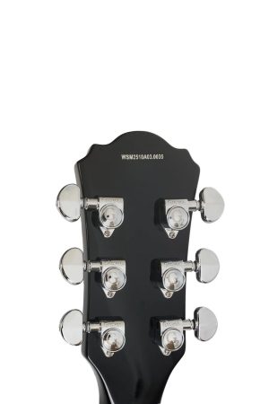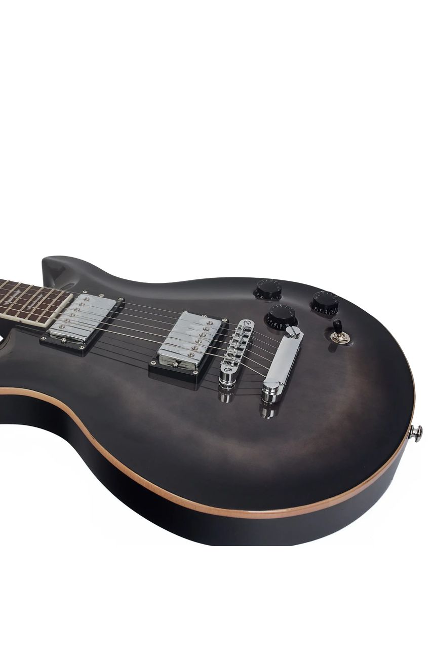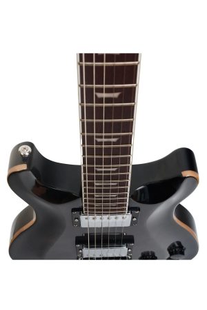 Construida con maderas seleccionadas que garantizan sustain y calidez en el sonido, incorpora pastillas humbucker que entregan un tono grueso y libre de ruido, perfecto para rock, blues o estilos versátiles. El mástil, probablemente de arce o caoba, ofrece una digitación cómoda y acceso a los trastes altos.