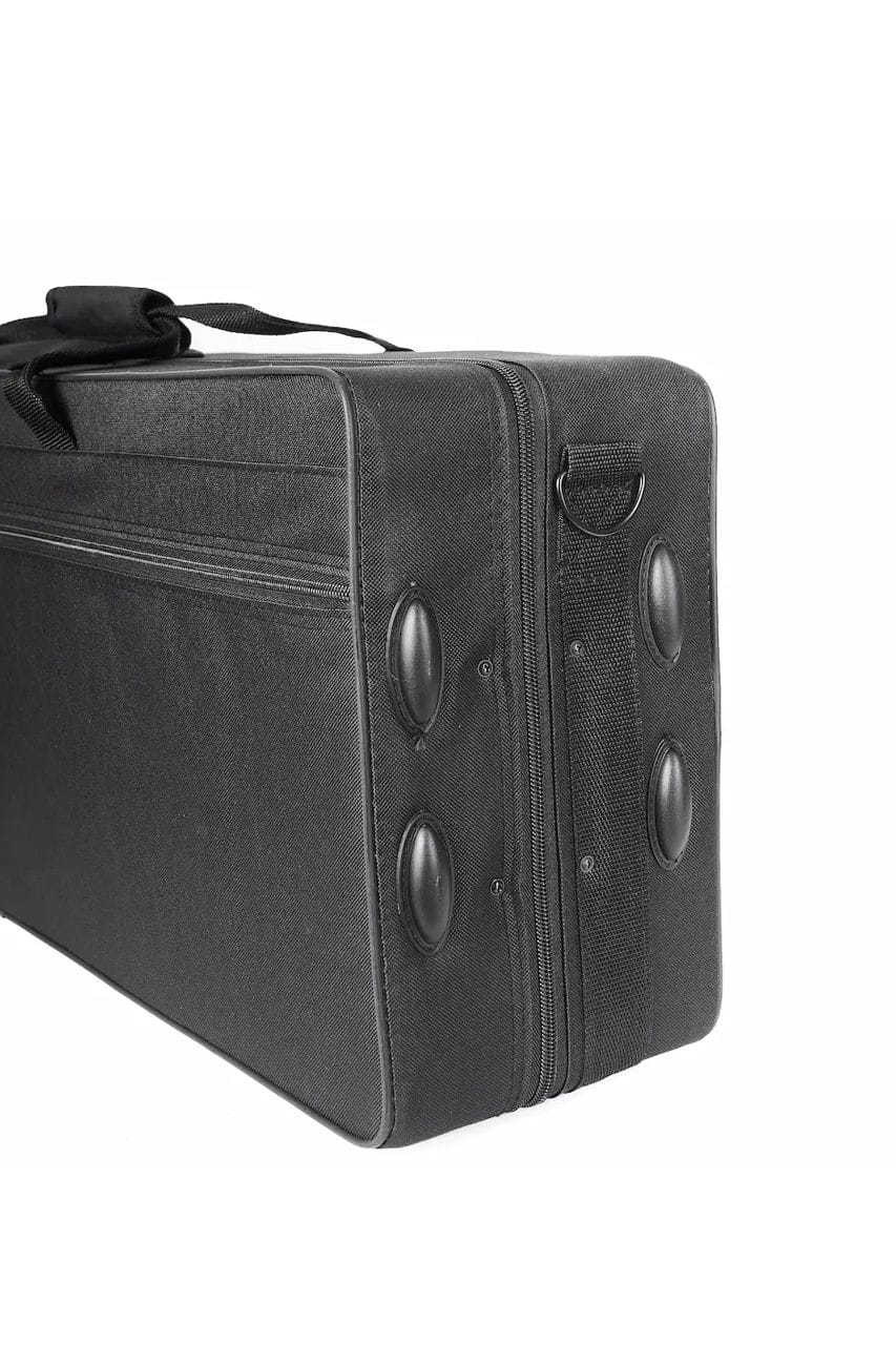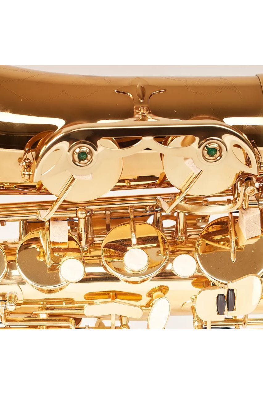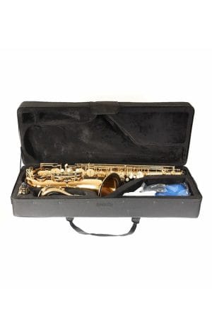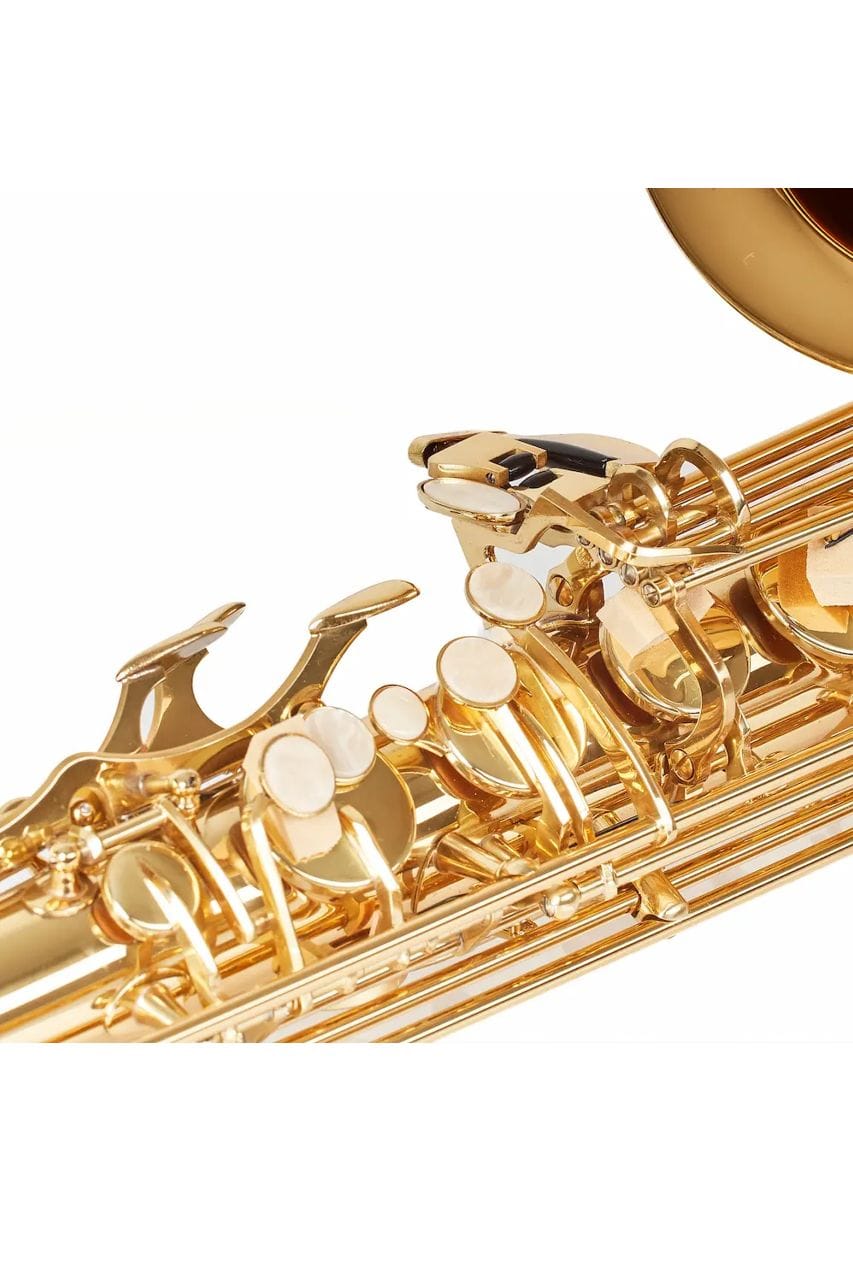 El cuerpo es de latón con lacado brillante, las llaves también lacadas y tienen un diseño ergonómico moderno que facilita la digitación. Incluye boquilla de ebonita (apertura 4C, corte tipo Selmer), caña, abrazadera metálica y tapaboquilla. Todo para que al abrir el estuche ya puedas empezar a practicar.